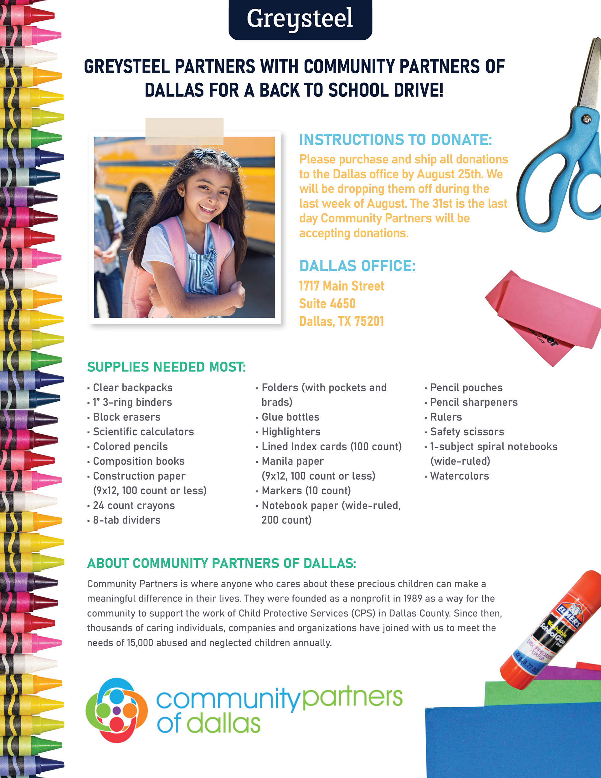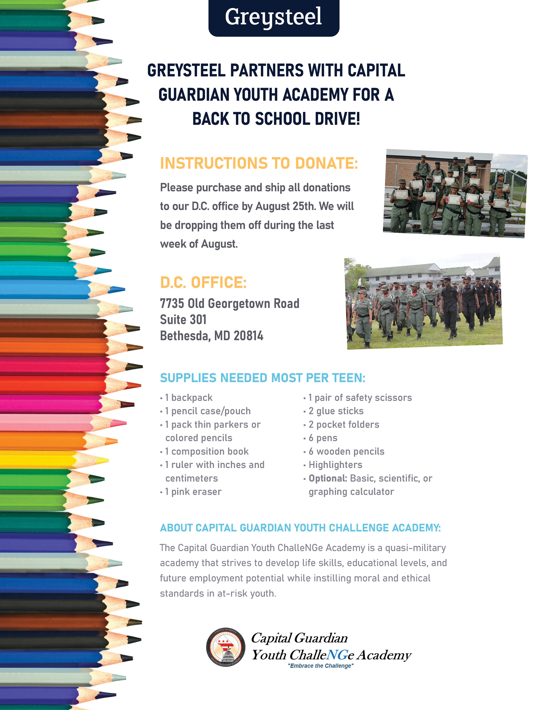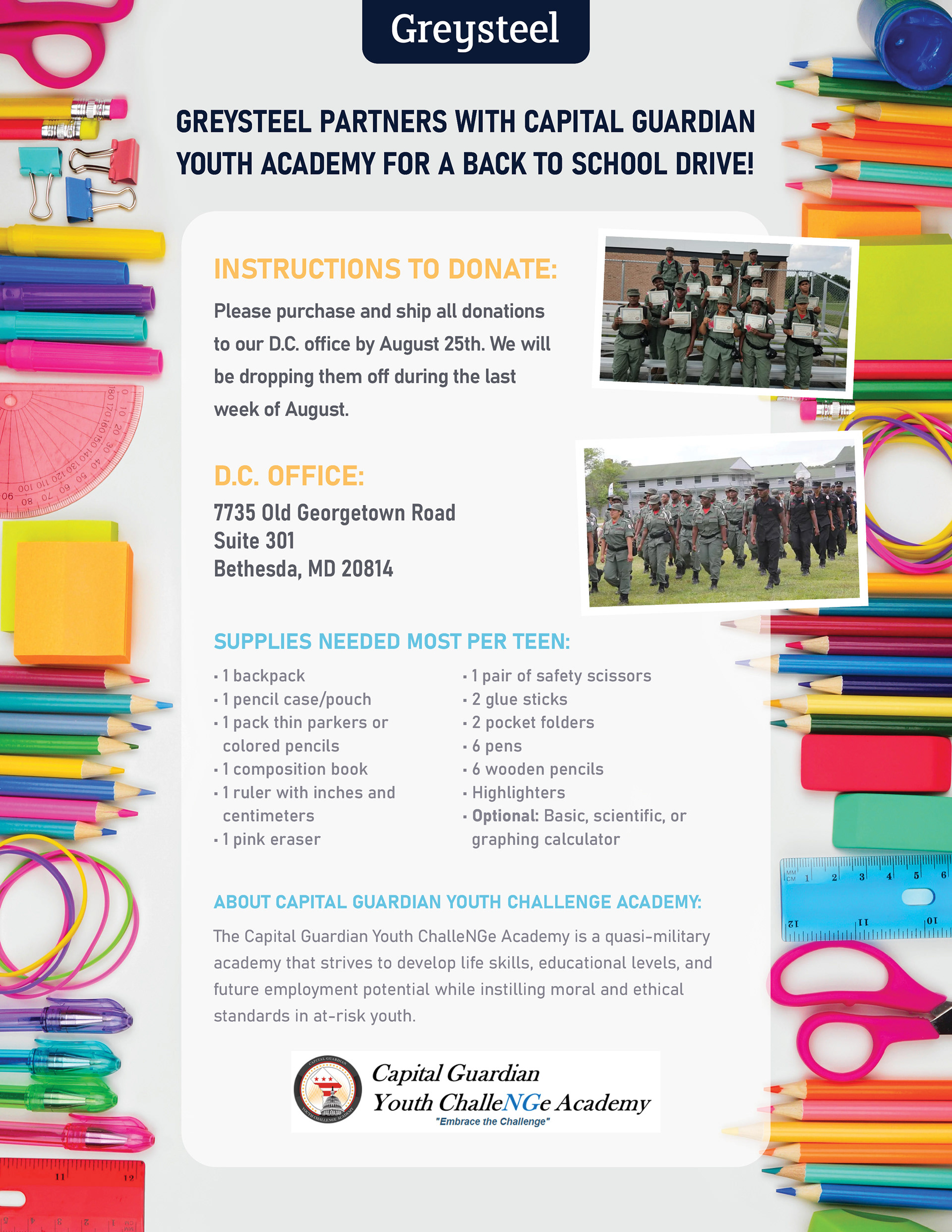 A few variations of a flyer for 2 locations participating in a Back to School Drive with different charities in D.C. and Texas.