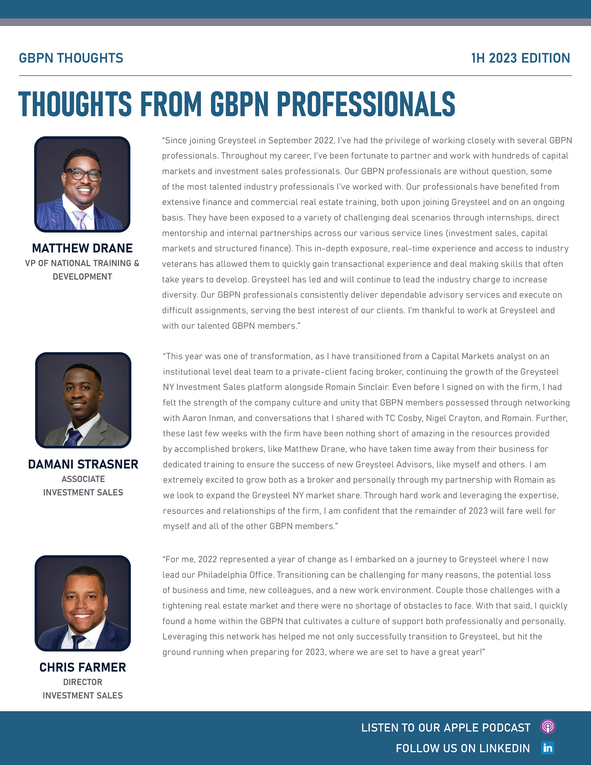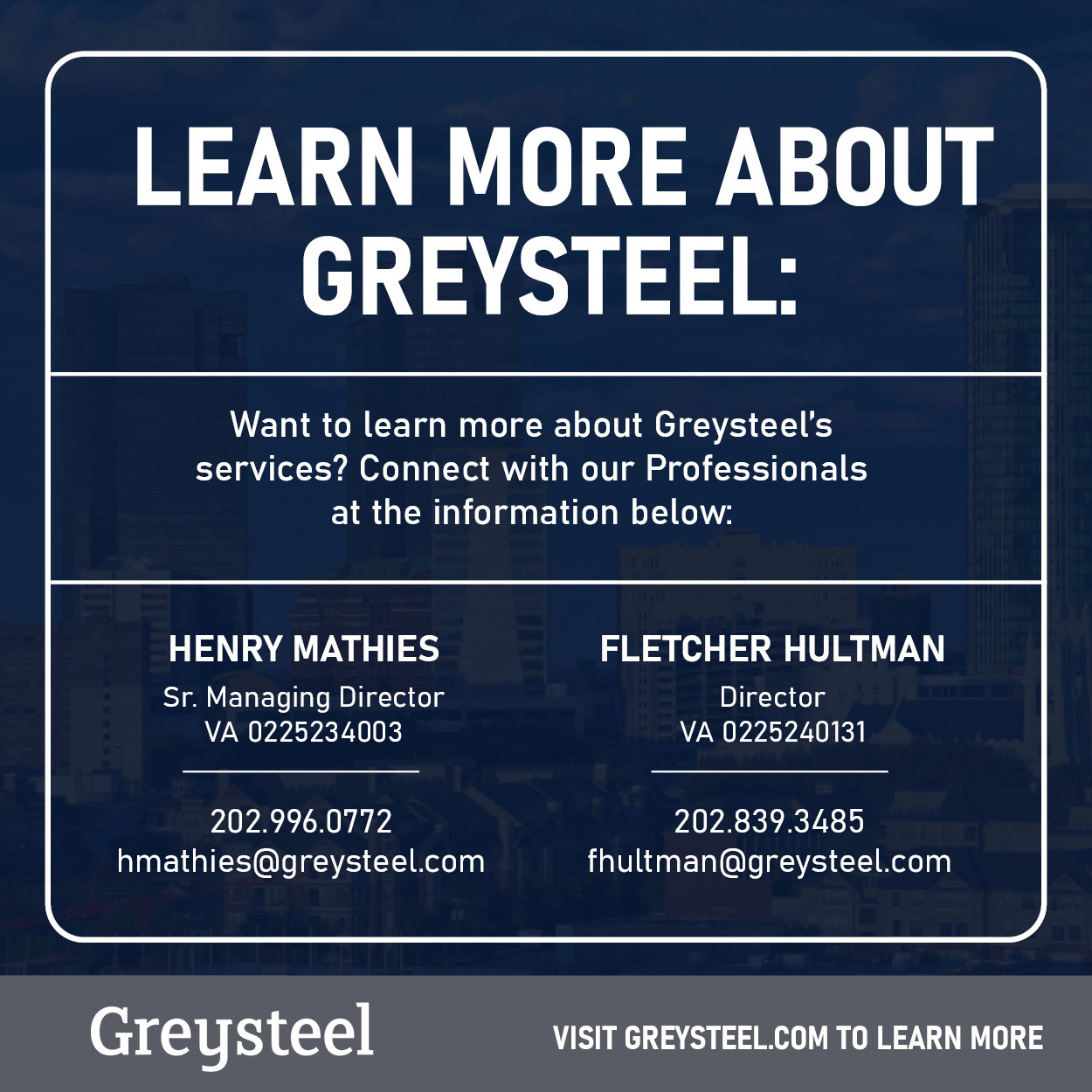 The majority of the work I do for Greysteel focuses on website management, social media marketing, event marketing, onboarding materials for every new hire, Powerpoint slides, newsletter creation, and much more. My company's style was rebranded recently and I have been tasked with perfecting it across different materials we offer. This includes, but is not limited to, social media templates, marketing positioning analyses, offering memorandums, event marketing, and email blasts. I do plenty of photo editing to create more appealing imagery and designs. I have been given more responsibility because of my slight perfectionist nature, need for organization, and overall tedious eye for detail. I have included a few pieces I've created over the past 2 and a half years, which are available to the public on our LinkedIn and Instagram profiles, and general eblasts. The materials are in no way for sale or meant for distribution.